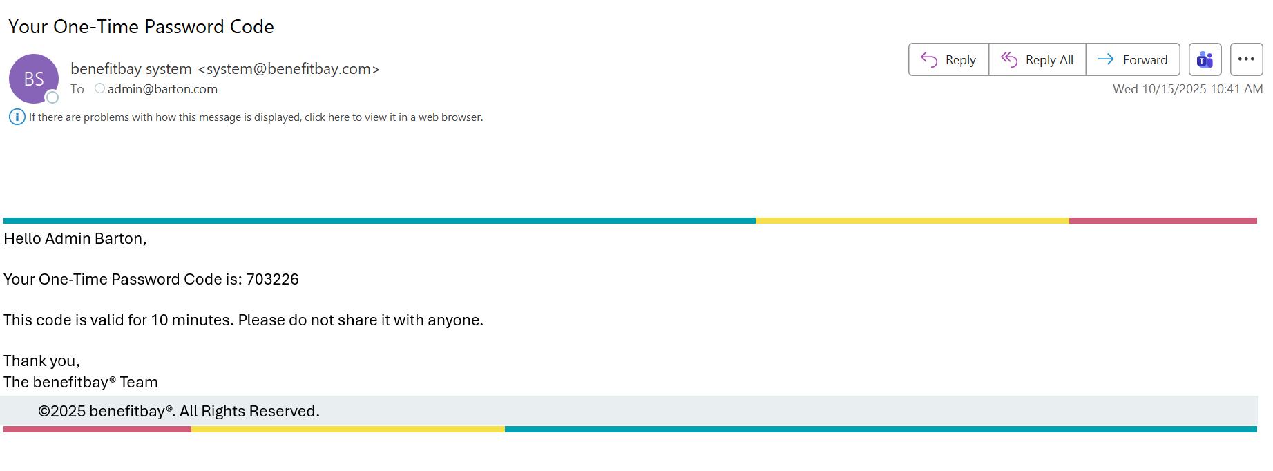 Upon logging in to benefitbay, the user will be sent an email (image below) with a one-time password code. They will enter the code and then be directed to their benefitbay access.
