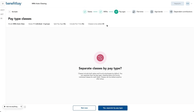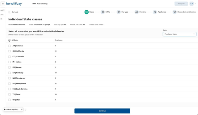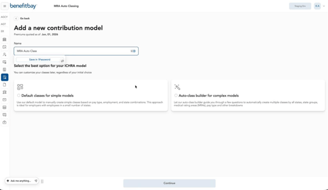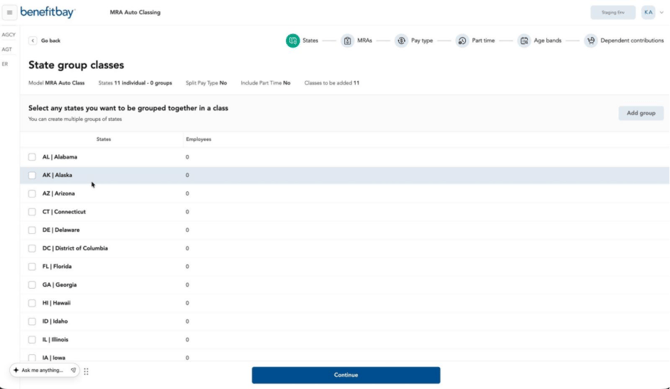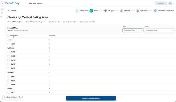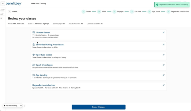 Medical Rating Area (MRA) Auto Classing helps create a new contribution model by building classes through a guided class-structure workflow which allows you to group states, separate classes by MRA, and create optional pay-type classes.