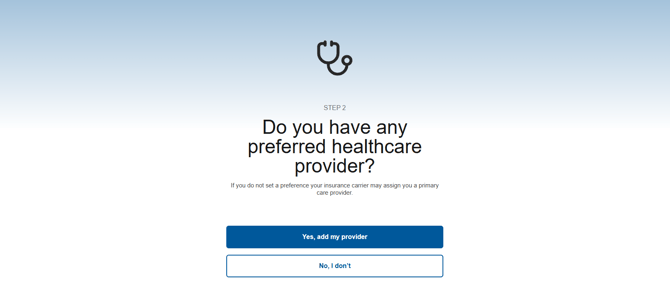Step 2 of your ICHRA enrollment is to complete your Benefitbay® profile by adding the healthcare providers and facilities that matter most to you and your loved ones. To continue, click the blue “Yes, add my provider” button.