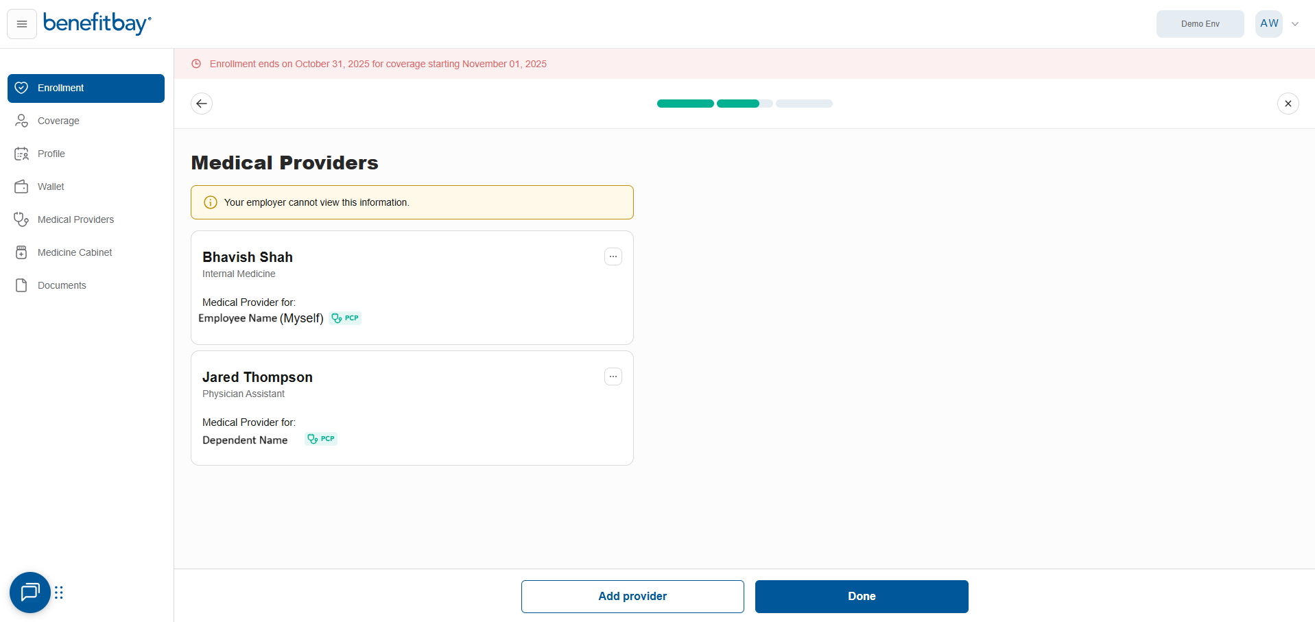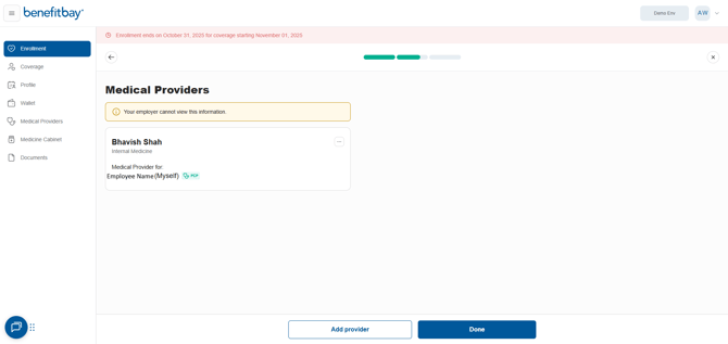 After adding all required providers for each family member, click "Done" at the bottom of the page to proceed to Step 3 of your enrollment.