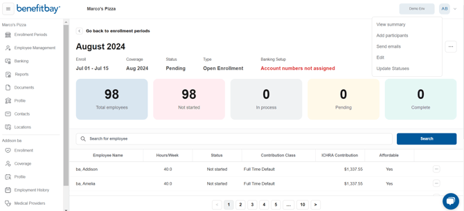 To remove employees from an enrollment period, you will follow the steps above. Click on the 3 dots in the top right corner of the screen and select the "Add participants" option. However, instead of checking the box next to an employee's name to add them to an enrollment period, you will select the box to un-check their name.