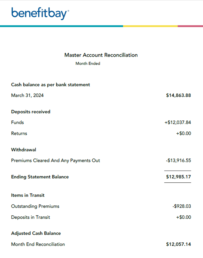 • Premium Payments Remaining to Clear - This amount is the employee premium payments that have not yet been drafted by the carrier and are expected to clear before the next scheduled funding.