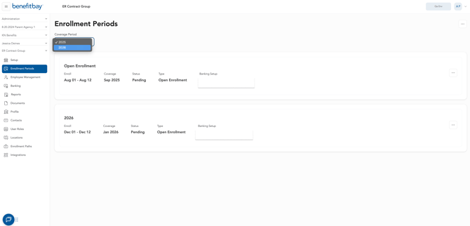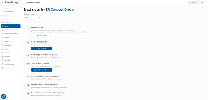 The contract will be located on the 'Setup' tab in benefitbay. If you don't see the 'Setup' tab, you may need to change the coverage period to 2026. This can be done on the 'Enrollment periods' tab using the drop-down menu.