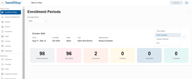 For further detail on the enrollment period, view the enrollment summary. Click the 3-dots menu in the top right corner of the enrollment period, and select, "View summary."