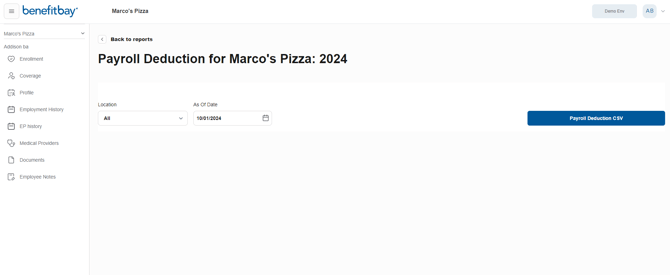 - Login to benefitbay and select the "Reports" tab on the left navigation bar under your company's name