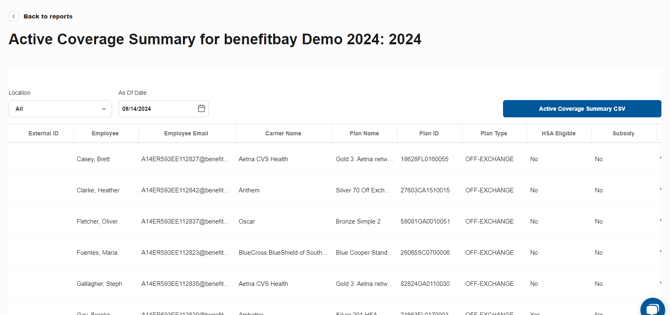 - Active Coverage Summary: This report will show you all the employees who have current coverage. There are additional carrier and plan details. If you notice an employee listed multiple times, that employee is enrolled in more than one plan. This is most common for employees on Medicare. You should forward date to the beginning of the month that you are looking at.