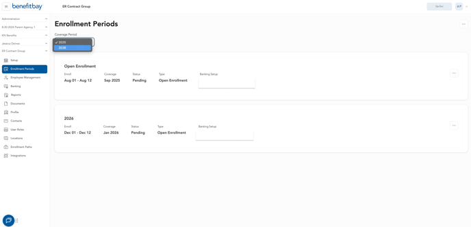 The contract will be located on the 'Setup' tab in benefitbay. If you don't see the 'Setup' tab, you may need to change the coverage period to 2026. This can be done on the 'Enrollment periods' tab using the drop-down menu.
